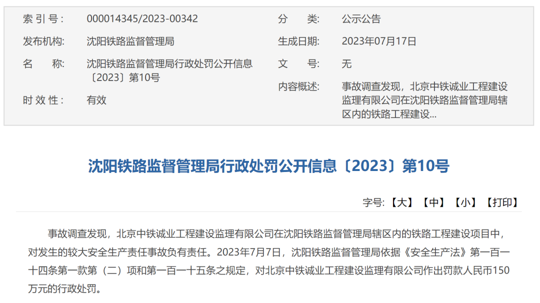 事故调查发现,北京中铁诚业工程建设监理有限公司在沈阳铁路监督管理局辖区内的铁路工程建设项目中,对发生的较大安全生产责任事故负有责任。2023年7月7日,沈阳铁路监督管理局依据《安全生产法》第一百一十四条第一款第(二)项和第一百一十五条之规定,对北京中铁诚业工程建设监理有限公司作出罚款人民币150万元的行政处罚。