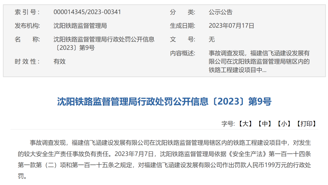 事故调查发现,福建信飞涵建设发展有限公司在沈阳铁路监督管理局辖区内的铁路工程建设项目中,对发生的较大安全生产责任事故负有责任。2023年7月7日,沈阳铁路监督管理局依据《安全生产法》第一百一十四条第一款第(二)项和第一百一十五条之规定,对福建信飞涵建设发展有限公司作出罚款人民币199万元的行政处罚。