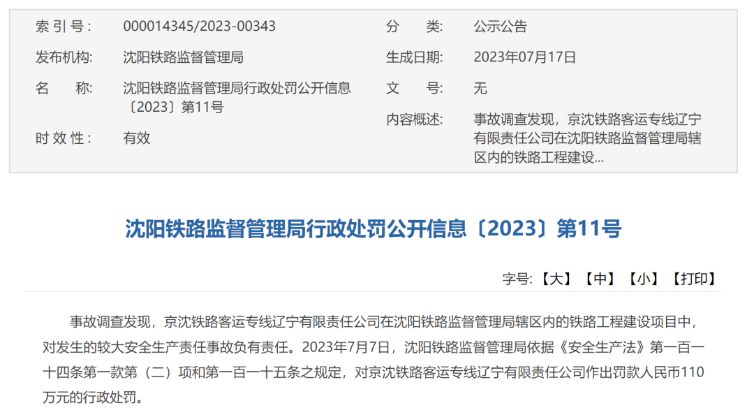 事故调查发现,京沈铁路客运专线辽宁有限责任公司在沈阳铁路监督管理局辖区内的铁路工程建设项目中,对发生的较大安全生产责任事故负有责任。2023年7月7日,沈阳铁路监督管理局依据《安全生产法》第一百一十四条第一款第(二)项和第一百一十五条之规定,对京沈铁路客运专线辽宁有限责任公司作出罚款人民币110万元的行政处罚。