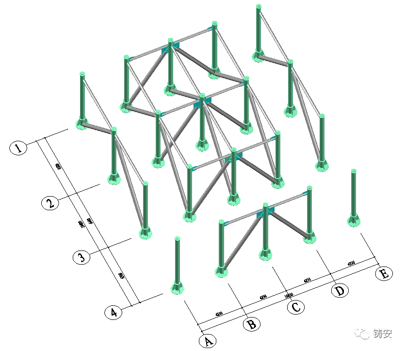 除尘器(A侧)底部共有20根钢支架柱,从南到北呈4行5列排列。由南向北柱距分别为6.5米、6.4米、6.5米;由东向西柱距均为4.23米。支架柱均采用φ426×10的无缝钢管,材质为20号钢,高度为7.5米。柱间支撑方面,南北向靠南2跨、东西向中间2跨,立面设有φ325×8对角钢架斜撑、φ245×8横撑,材质为20号钢。钢支架结构见图2。