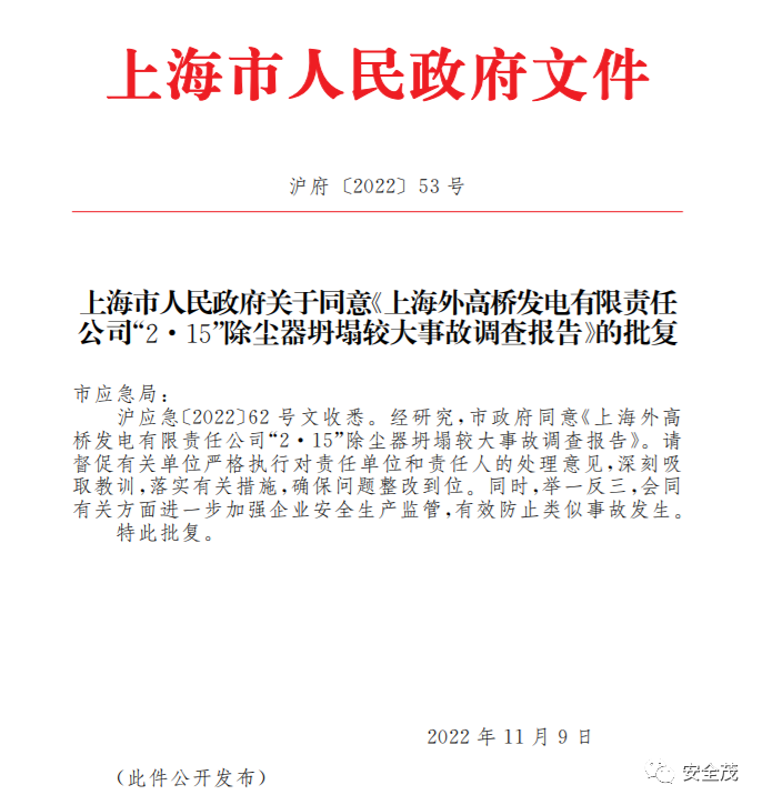 经调查认定,上海外高桥发电有限责任公司“2·15”除尘器坍塌较大事故是一起生产安全责任事故。