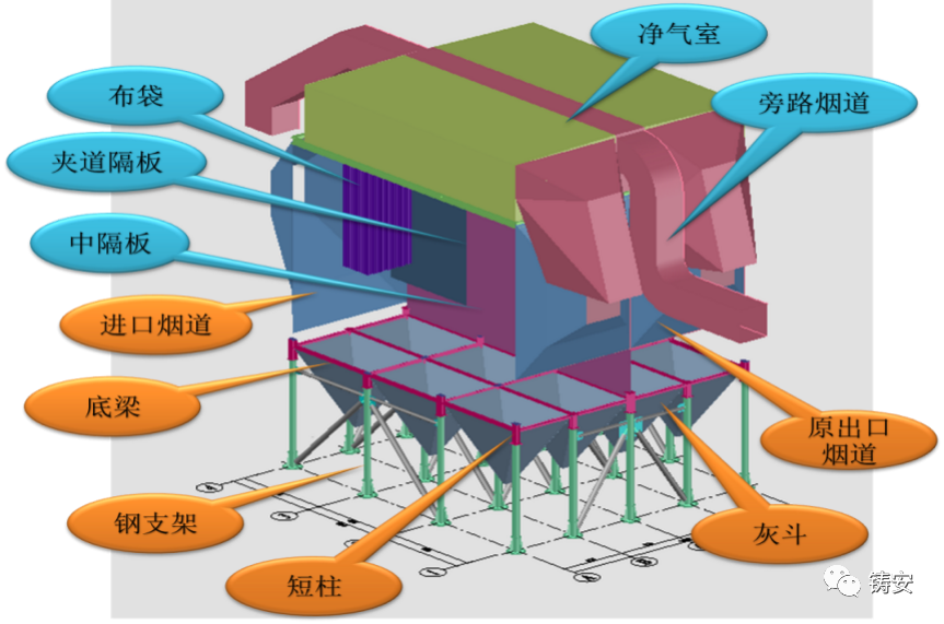 改造过程中拆除了原电除尘器极板、极线等内件,增加中间隔板,将原来2台双室三电场电除尘器改造设计成4个独立的袋式除尘单元,增设2条旁路烟道,使得除尘器设备的整体自重和结构受力分布情况发生了变化。