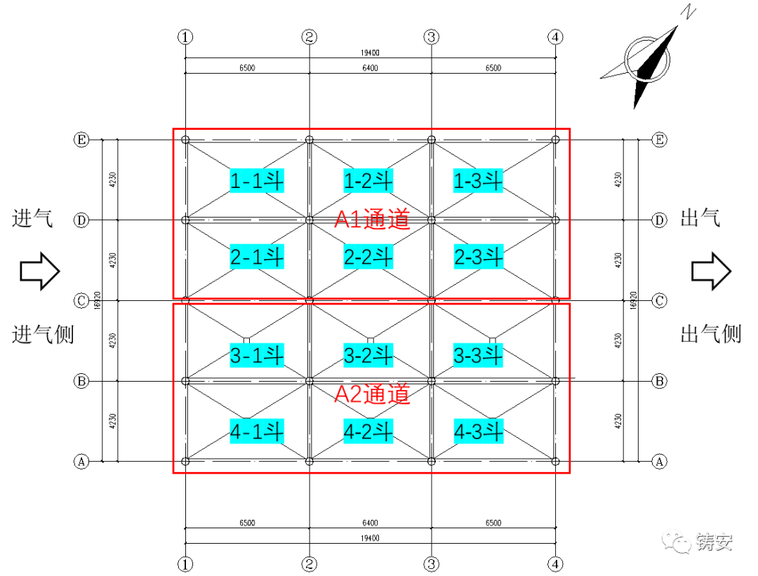 外高桥电厂2号机组布袋除尘器由上箱体(净气室)、中箱体、灰斗、底部钢支架等组成,结构形式为钢结构支架支承除尘器结构。除尘器总长度19.4米,总宽度36.84米,沿东西向分为对称的两部分(A、B侧),两侧共有4个独立通道(即A1、A2、B1、B2通道)并联运行。两部分间距3.0米,有步道相连,每部分4跨。除尘器(A侧)总体结构见图1。