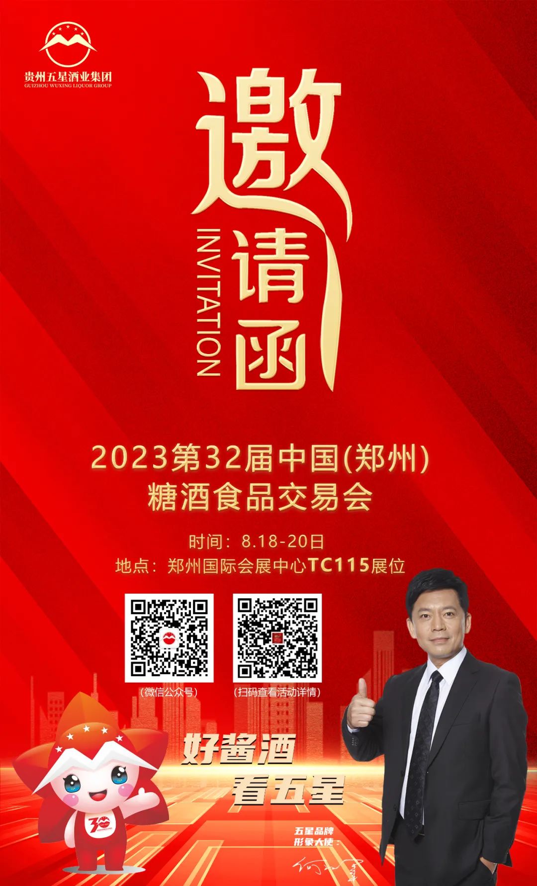仲秋八月,秋高气爽!8月18日-20日,以“引领食尚 促进消费”为主题的2023第32届中国(郑州)糖酒食品交易会(简称:郑州糖酒会),将在郑州国际会展中心隆重举办。贵州五星酒业集团将携热销系列产品亮相TC115展位,欢迎各位经销商朋友们参观莅临,共商财富盛宴!