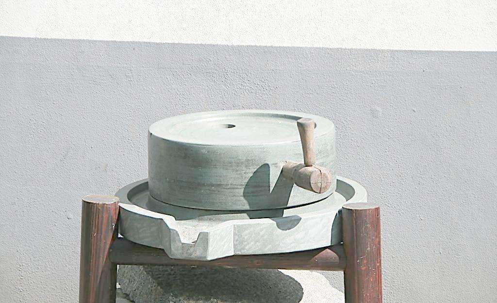 石磨由上下两合圆柱形石材制成,下方多配置石质接料槽,上下两扇石磨合成一盘石磨,成为“一合”。