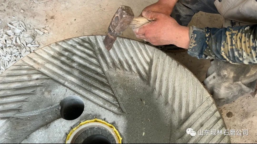 凿好了的磨盘,再被移送到下一道工序:用细沙纸研磨,使得上下磨盘之间更加契合, 并且不断对磨齿进行修正。