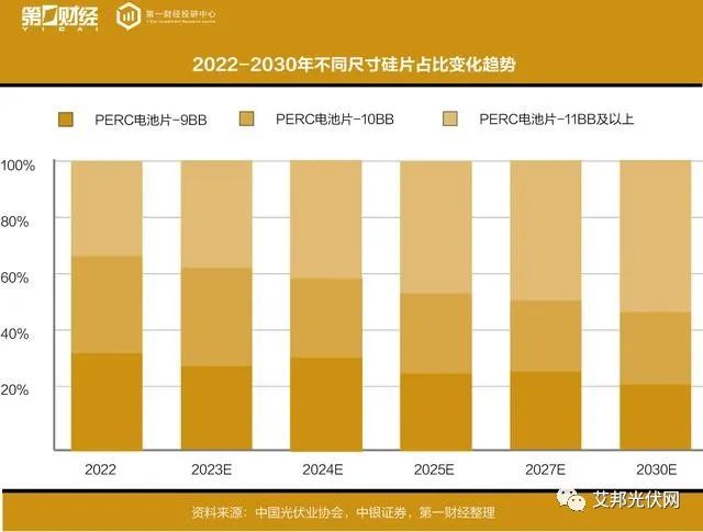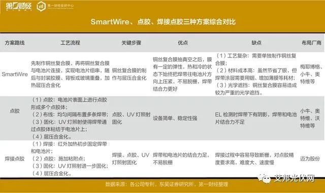 SMBB可谓MBB技术的升级版,通过采用更细的栅线,减少银浆用量,实现更少的遮挡和更短的电流传输距离,从而有效降低串联电阻,进一步提高电池对隐裂、断栅、破裂的容忍度,提高可靠性。SMBB技术多为15-25BB,即单个电池片上印刷有15-25条主栅。目前,TOPCon多采用SMBB方案,部分头部异质结企业也已实现18+BB量产。中国光伏行业协会数据显示,2022年新投产的TOPCon电池片大多为182mm或210mm尺寸,其中采用16BB技术的占比约51.3%,11BB市场占比约为36.9%,9BB或10BB市场占比仅11.8%左右。未来,随着新产能的释放叠加旧产线的技术升级,业界预计2030年16BB技术市场占比将攀升至99%以上,9BB或10BB技术或被完全取代。从SMBB的切入速度来看,2022年TOPCON电池开始批量生产,行业开始试用SMBB技术。奥特维在投资者调研纪要中表示,2022年公司SMBB设备在串焊机订单中占比近30%,2023年一季度的订单中,数家龙头企业购买的基本都是SMBB设备,从全年订单结构来看,SMBB设备占比相较2022年将大幅上升。目前,采用SMBB技术的厂商包括一道新能、通威股份(600438.SH)、阿特斯、晶澳科技(002459.SZ)等。据悉,通威股份已突破SMBB技术壁垒,特别是在210mm大尺寸领域实现了行业首家SMBB组件产品的规模化量产。2022年,一道新能推出高功率54版型SMBB组件新品。该产品沿用M10系列电池尺寸,并采用54片全新设计版型,输出功率最高可达420W、输出效率高达21.5%。阿特斯N型TOPCon(TOPBiHiKu7)组件基于210mm尺寸硅片和电池,结合了SMBB组件端的技术,功率相比P型PERC双面组件提升了20~25W,组件效率从最高21.4%提高到22.2%。晶澳科技N型组件产品DeepBlue4.0Pro采用N型钝化接触Bycium+电池技术,同时集成SMBB技术、高密度封装技术等提质增效技术。设备厂商方面,2022年,奥特维批量交付了SMBB设备,并率先在客户端完成稳定量产,叠加排版机、叠焊机、智能串检等设备,公司已拥有超薄片SMBB组件的整线解决方案。先导智能(300450.SZ)的全兼容超高速串焊设备量产效率在10000片/小时以上,兼容多栅+半片技术及多种无损切割等划片技术,兼容156-230mm全部电池尺寸。0BB工艺取消了电池主栅银电极,用焊带取而代之,可直接与细栅互联从而汇集细栅电流。一方面,该技术能够有效降低银耗。目前量产PERC、TOPCon银浆成本分别为0.06元/W、0.07元/W,HJT已量产的210mm尺寸15BB银浆成本为0.15元/W、即将量产的20BB银浆成本为0.12元/W。若0BB技术投入使用,PERC、TOPCon、HJT银浆成本分别为0.03元/W、0.06元/W、0.09-0.08元/W。对于降银更加迫切的HJT而言,若采用0BB+银包铜浆料,银浆消耗量将进一步减少。15BB+银包铜浆料、20BB+银包铜浆料的单W银包铜浆料成本分别为0.04元、0.03元。另一方面,相较于MBB组件焊带0.2-0.4mm的直径, 0BB焊带直径为0.2mm,遮光面积更小、电流传输距离更短,从而能够降低功率损耗、提高发电效率。目前0BB技术主要有三种串焊方案,分别是SmartWire、点胶、焊接点胶。Smart Wire可以说是最早的0BB方案,在2003年由加拿大光伏企业Day 4 Energy提出。该方案优势是焊带与电池片的贴合度高,但目前Smart Wire专利由总部位于瑞士的光伏设备公司梅耶博格独享,专利保护期至2034年,再加上复合膜成本较高等问题,国内暂未实施大规模推广。点胶方案总共包含点胶、布线、固化、层压合金化四个步骤。该方案的优点是设备简单、稳定性强,缺点是EL检测时焊带下有阴影,有阴影表明少子寿命和注入电流的密度不够,且焊带与电池片的贴合度不高。焊接点胶方案是比点胶方案多出一步焊接,即焊带与电池片初步焊接在一起的步骤。这种方案的优点是焊带与电池片的贴合度高,缺点是焊接过程中易发生断栅,对点胶精度要求较高。2023年4月,东方日升(300118.SZ)4GW高效25.5%异质结0BB电池全线贯通,首批HJT电池下线,标志着0BB首次在GW级量产线上得到应用。5月在2023年SNEC展会上,东方日升和爱康科技(002610.SZ)推出的采用0BB技术的HJT组件功率分别高达741.456W和730W。随着组件龙头对0BB和HJT接受度的不断提升,东吴证券预计2025年0BB设备市场空间有望近30亿元,2023-2025年CAGR达285%。设备厂商中,奥特维2023年5月在投资者调研中表示,公司0BB设备有很多家客户在验证,2023年已拿到行业龙头企业的小批量0BB串焊机订单,预计2023年下半年0BB串焊机可能会量产。2023年3月,迈为股份采用先焊接再点胶方式的0BB串焊机在安徽华晟新能源验证。2022年11月,先导智能推出量产型0BB串焊设备,量产效率超过6800片/小时,可实现100μm厚度电池片串焊。此外,非上市公司宁夏小牛在点胶、类似Smart Wire两种方案上均有布局,已在下游客户处验证;苏州沃特维、深圳光远在0BB设备领域也有布局。