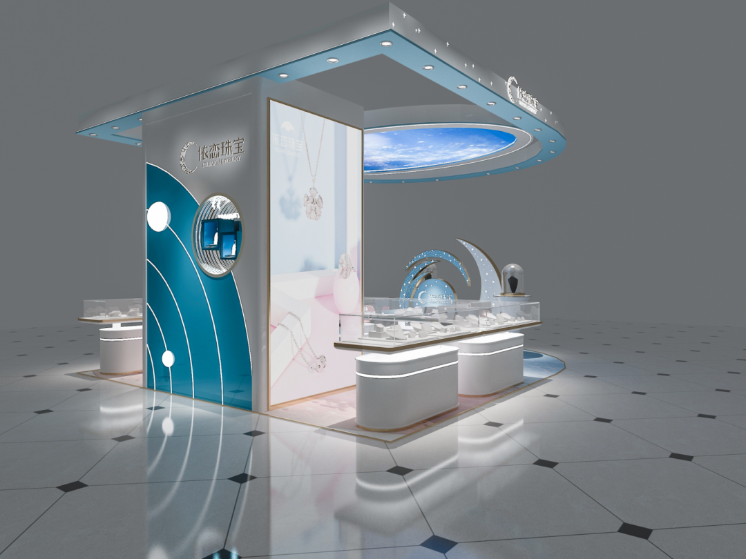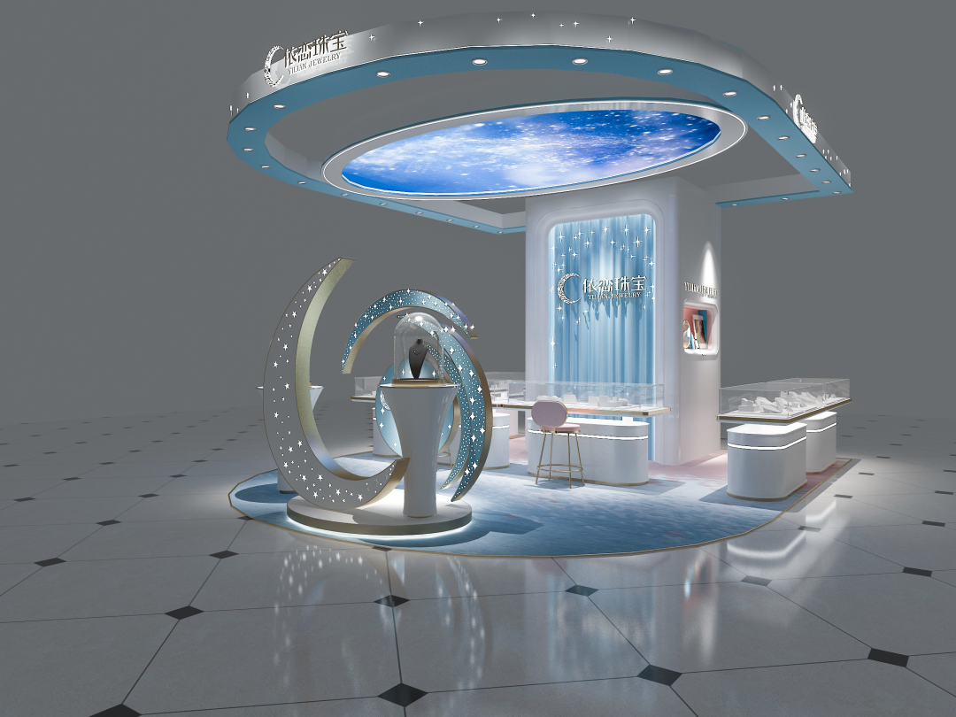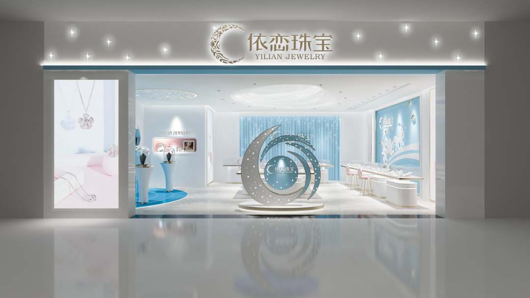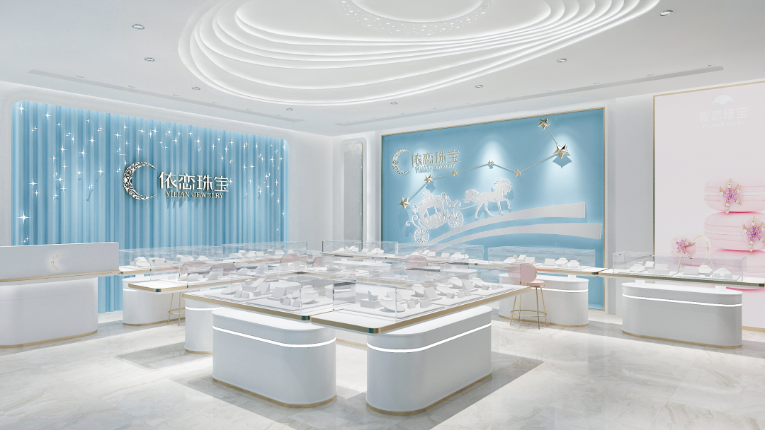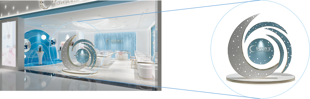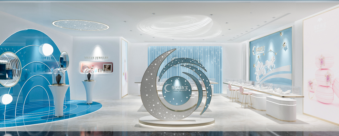 整个店内在色调上运用品牌蓝色和白色搭配,吊顶采用月亮、星星为造型,墙面做浪漫点缀,每一个细节都充满依恋的品牌核心元素,给到店顾客带来视觉享受。