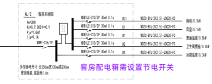 落实措施:各级旅馆客房配电箱进线开关处应设置节电开关。