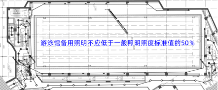进行游泳馆照明设计时,依据GB55016-2021规范要求,其备用照明最低标准不应低于100lx(等级I)。以前常见做法是仅在泳池四周设置疏散照明(最低照度要求不小于10lx,疏散照明兼做备用照明从技术上也不合理),泳池场地照明按照三级负荷单路供电设计,不满足GB55016-2021第3.3.11条要求。