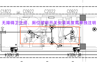 照明开关、空调开关安装要求通常在图例表中表示,对无障碍卫生间内照明开关安装高度的特殊要求,经常被电气设计人员忽视,用了一个图例表中的普通开关。这种开关安装高度一般不低于1.3m,不满足GB55019-2021第3.1.6条要求。