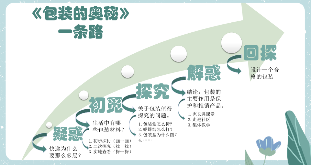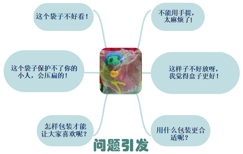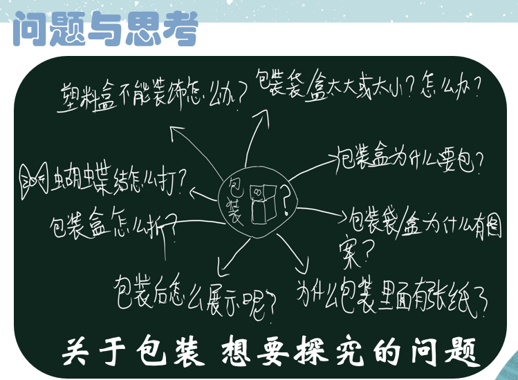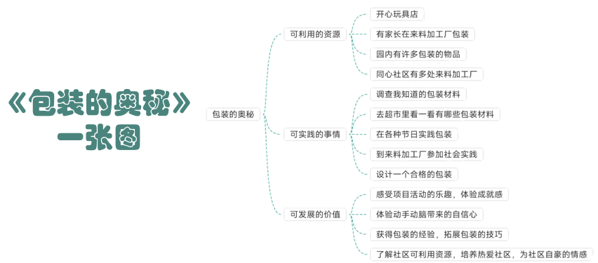 前期,统计调查列出了幼儿对包装的认识,了解他们的知识准备,接下来是将他们想知道,想要学习的关于包装的知识画成一个网络图。
