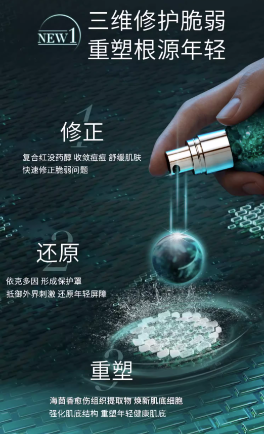 修护灵魂成分海茴香浓度升级50%,焕活肌底新生「海洋生物多糖」根源抑制皮脂腺出油,协同海茴香内源补水抑油;「多肽酵母提取物」激活关键蛋白,协同海茴香外源重塑屏障。