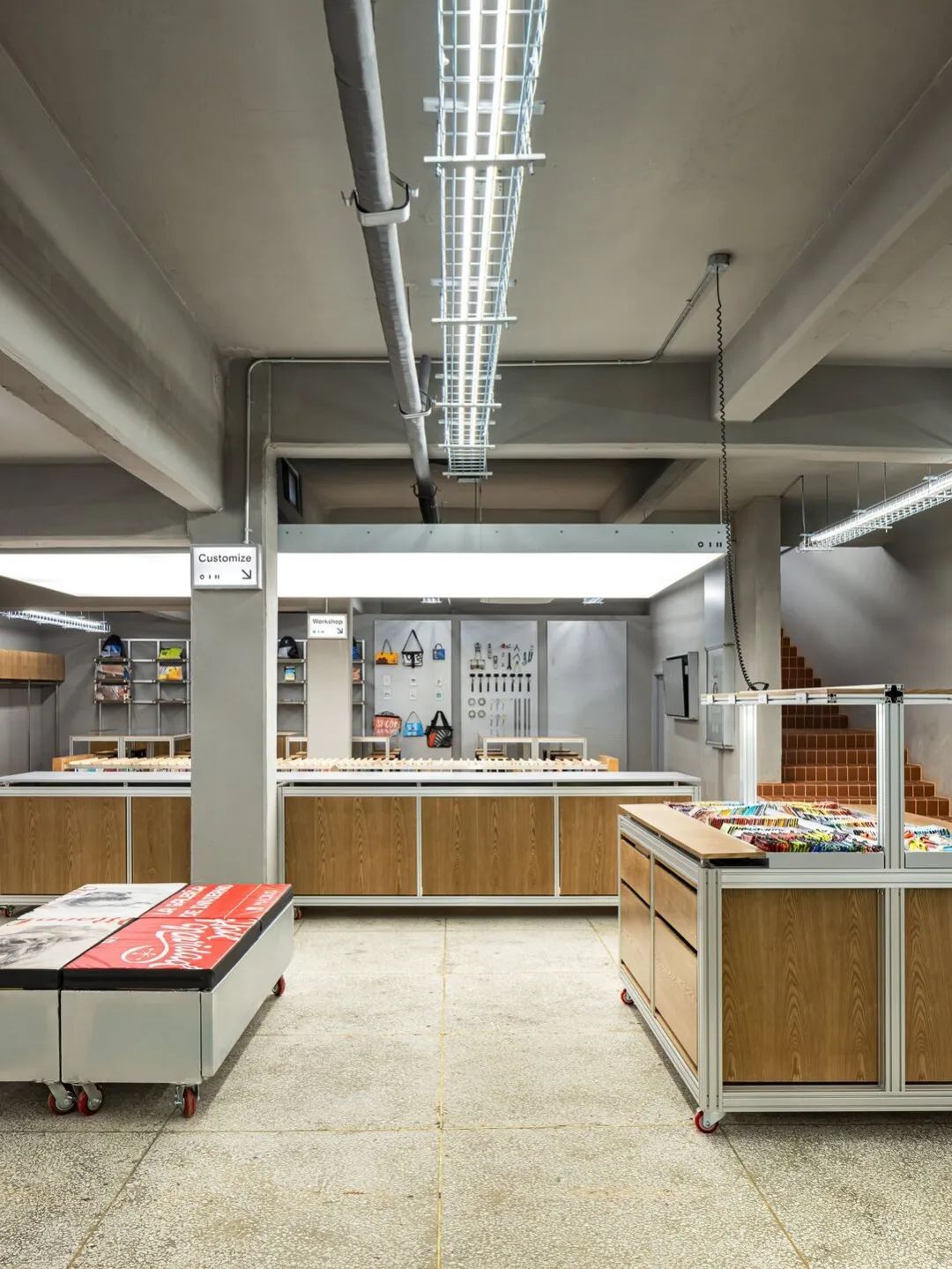 墙壁轮廓也是Nukak设计师们重要考虑的因素之一。他们设计的墙壁轮廓可以根据产品组的展示做出调整,从而提供更好的展示效果。此外,Nukak的定制区也是其与其他商店区别开来的地方。在这个区域中,顾客可以直接从店里挑选材料来制作配件。为了赋予空间力量,Nukak采用表面照明的设计手法,使定制区成为整个空间的亮点。