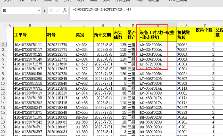 =XLOOKUP(CHOOSECOLS(H2#,3)&OFFSET(P2#,,-1),'1.程序数据'!B3:B20000&'1.程序数据'!D3:D20000,'1.程序数据'!G3:G20000),这样就把机械臂坑位对应类别中的款型对应的程序加工周期向上取整的数据时间索引过来了。根据这个时间,计算出对应的每小时产出。录入公式:=3600/N2#/2,举例说明:就是一小时3600秒除120秒,得到30 PCS,因为有两个坑,所以再用30/2,得到15 PCS 每小时。