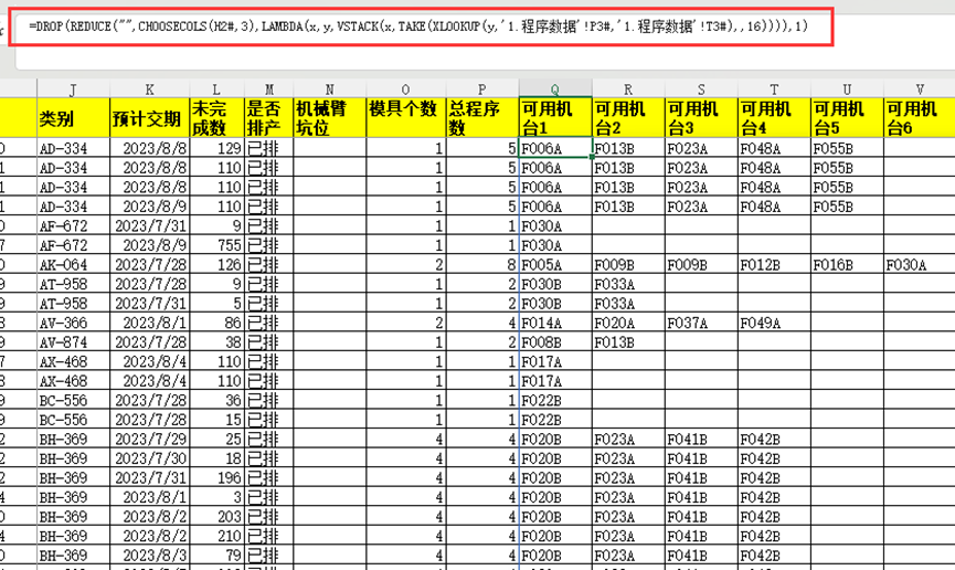 最后一个函数是有点复杂的,思路就是利用前期建立好的类别对应机械臂坑位的数据库,再用XLOOKUP的批量引用方法一起引用过来,其中TAKE函数是保留几列的目的,此时如果觉得太多了,可以选择只保留前6列,这样的话数据范围就会少一点。