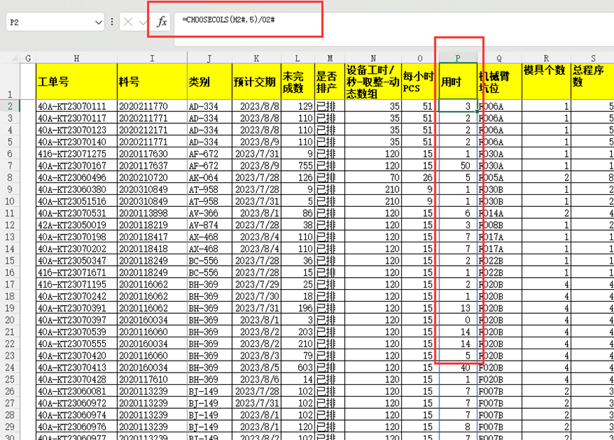 再计算出对应的工时,用机械臂待切割的加工数量除以每小时的切割的产品数量,录入公式=CHOOSECOLS(H2#,5)/O2#,得到加工完这些款型的产品的工时,汇总后得到是:12684 个工时。
