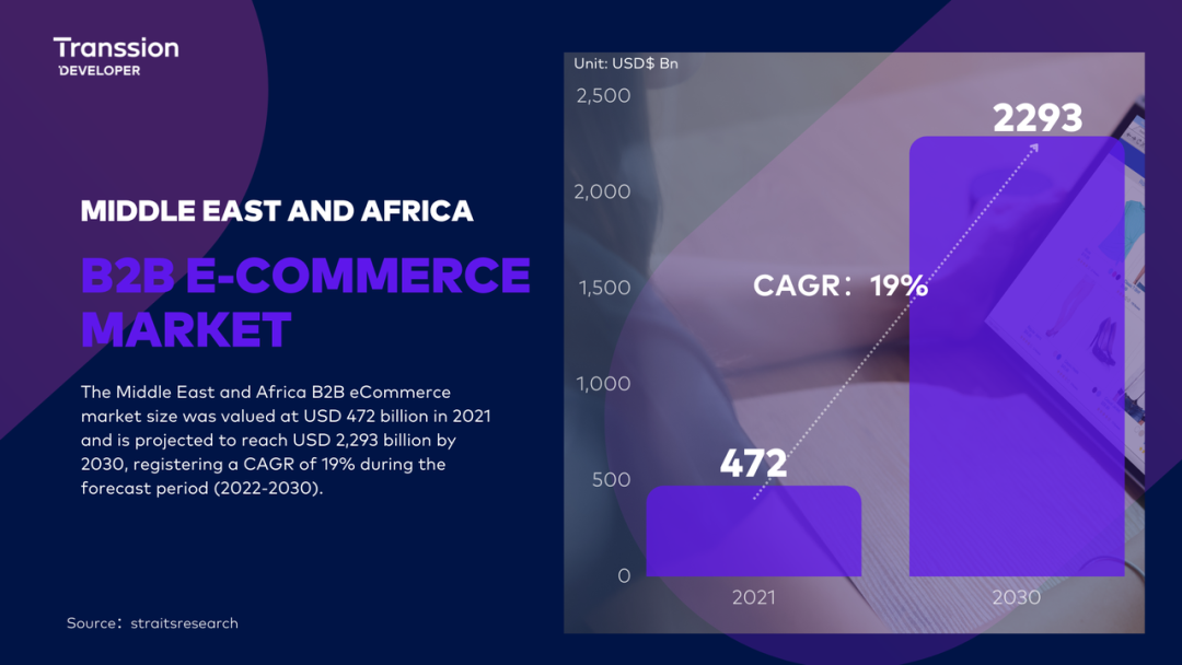 Straits Research 数据显示,2021 年,中东和非洲 B2B 电子商务市场规模为 4720 亿美元 ,预计到 2030 年将达到 22,930 亿美元, 预测期内(2022-2030 年)复合年增长率为 19% 。