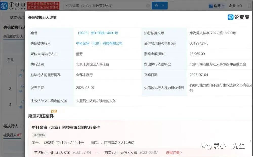 企查查APP显示,近日,中科金审(北京)科技有限公司被北京市海淀区人民法院列为失信被执行人,涉案金额约1.4万元。