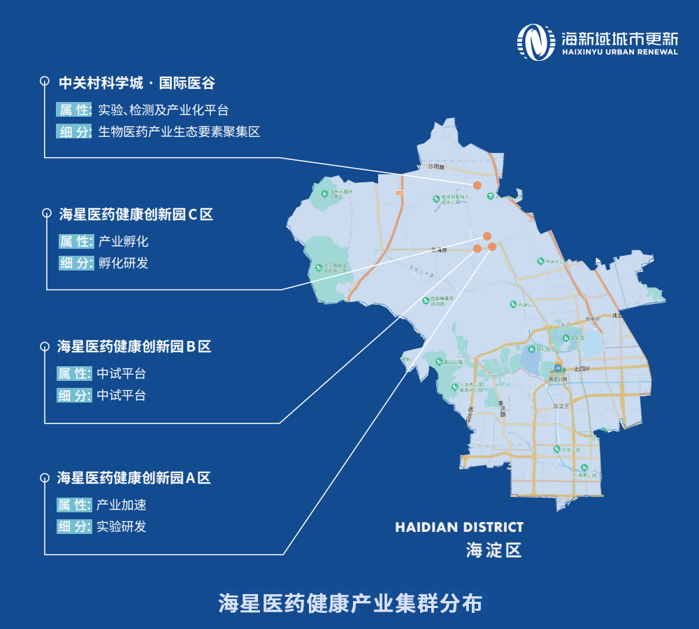在北清路沿线,海新域通过新建及改造升级方式构建了医药健康产业版块。以海星医药健康创新园(A、B、C区)为轴心,围绕中关村科学城·国际医谷,实现以点成线,以线成面的医药健康产业空间载体布局。综合以上四个区域,海新域将在海淀区构建以多元化、专业化、加速化、规模化总计约80万平米的产业空间,聚焦细胞治疗、基因治疗、合成生物学、Al医疗等前沿产业领域,构建全产业链的医药健康产业生态圈。
