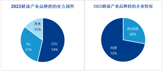 “2023健康产业品牌榜”54%为OTC品牌,处方药品牌占31%,从数量方面对比,OTC品牌显然更具有行业的竞争优势。“健康中国2030”战略促使我国医药健康产业规模快速成长,一批具有较强竞争力的内资企业也在不断崛起,“2023健康产业品牌榜”上榜品牌中,内资的品牌占72%,在多个细分品类中扮演重要角色。