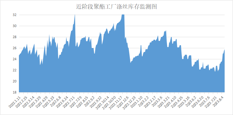 库存方面,根据绸都网统计数据来看,现如今聚酯市场整体库存集中在18-28天;具体产品方面,其中POY库存至20-28天,FDY库存至18-27天附近,而DTY库存则至16-27天左右。