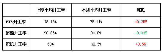 开工率方面,PTA平均开工率在78.41%,较上周上涨0.25%;聚酯方面,聚酯平均负荷为90.8%,较上周回落0.06%。市场气氛有所好转,秋冬面料订单开始下达,织造开机率有所回升,在68.5%左右。