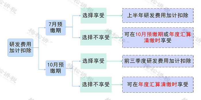 对7月份预缴申报期未选择享受优惠的企业,10月份预缴申报或年度汇算清缴时能够准确归集核算研发费用的,可结合自身生产经营实际情况,自主选择在10月份预缴申报或年度汇算清缴时统一享受。