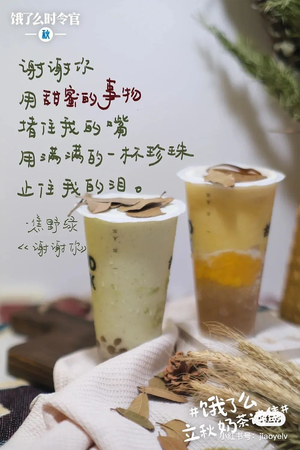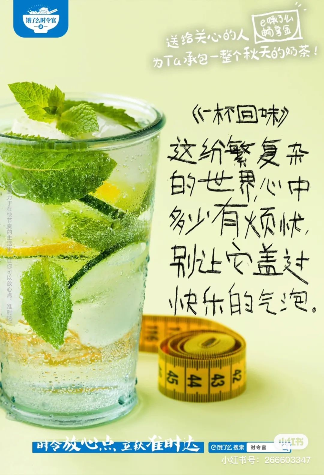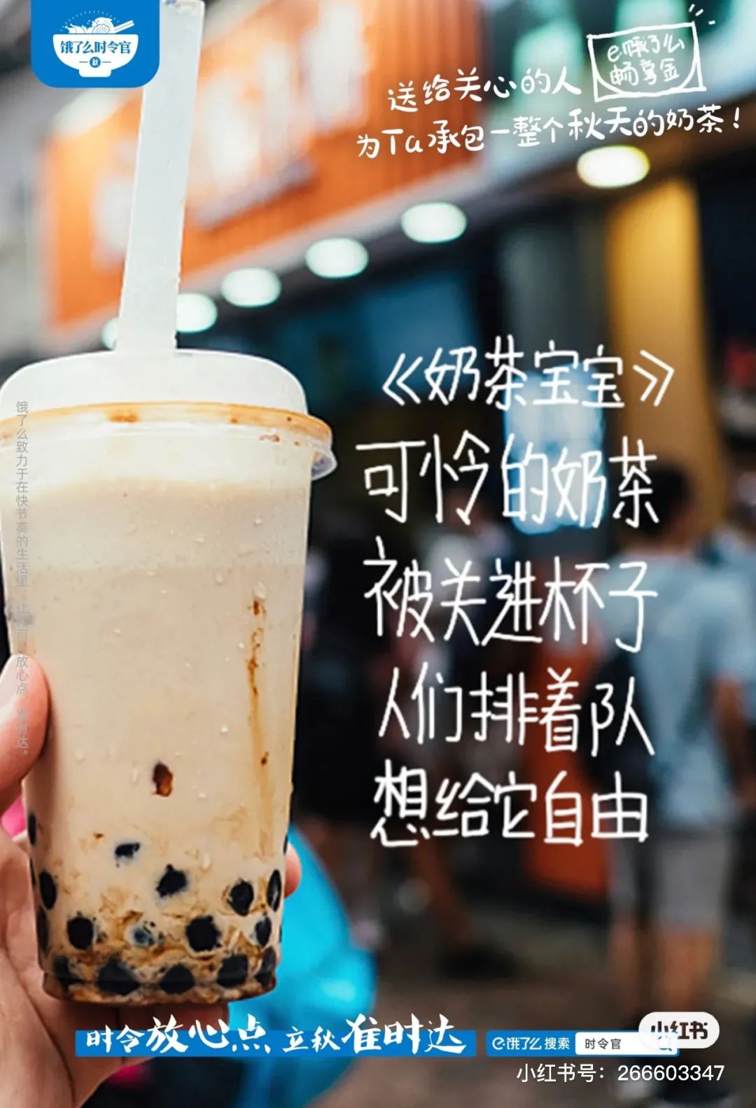 #秋天的第一杯奶茶#这个梗自从诞生,每年的秋天都会被品牌拿来做为宣传背书。今年,饿了么邀请了五位诗歌创作者发起了“饿了么立秋奶茶诗歌”活动,借奶茶传递情绪,文案细腻,把当代网友的各种情绪拿捏得死死的~