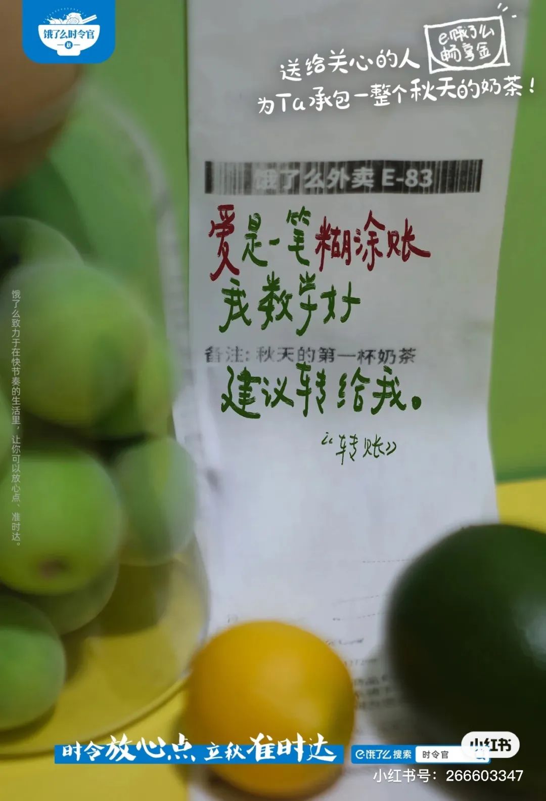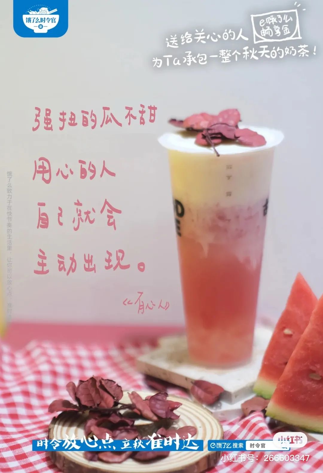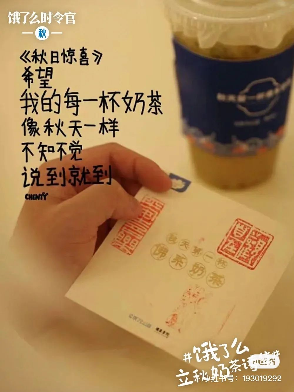 #秋天的第一杯奶茶#这个梗自从诞生,每年的秋天都会被品牌拿来做为宣传背书。今年,饿了么邀请了五位诗歌创作者发起了“饿了么立秋奶茶诗歌”活动,借奶茶传递情绪,文案细腻,把当代网友的各种情绪拿捏得死死的~