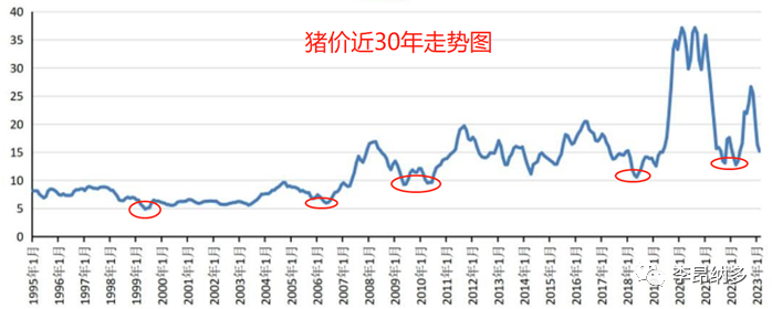 下图是猪价1991年-2018年的走势图,从图中我们可以看出,猪价的底部在不断抬升,从1992年的3块多,到1999年的5块,再到2022年的14块,猪价每轮下跌的低点基本都要比上一轮更高。