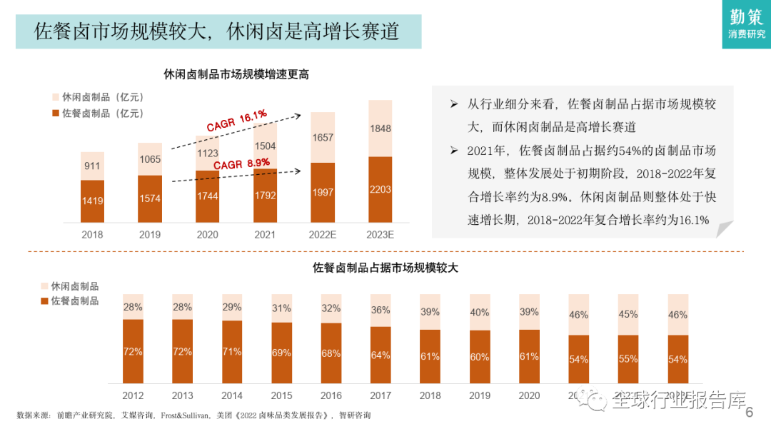 从行业细分来看,佐餐卤制品占据市场规模较大,而休闲卤制品是高增长赛道