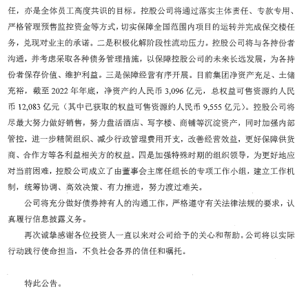 公告称,集团将与各持份者沟通,并考虑采取各种债务管理措施,维护投资者的合法权益。后续集团亦将继续稳妥推进各项风险化解措施和经营策略,以保障集团的未来长远发展。控股公司成立了由董事会主席任组长的专项工作小组,建立工作机制,统筹协调、高效决策、有力推进,努力渡过难关。