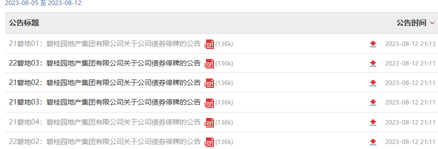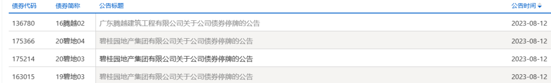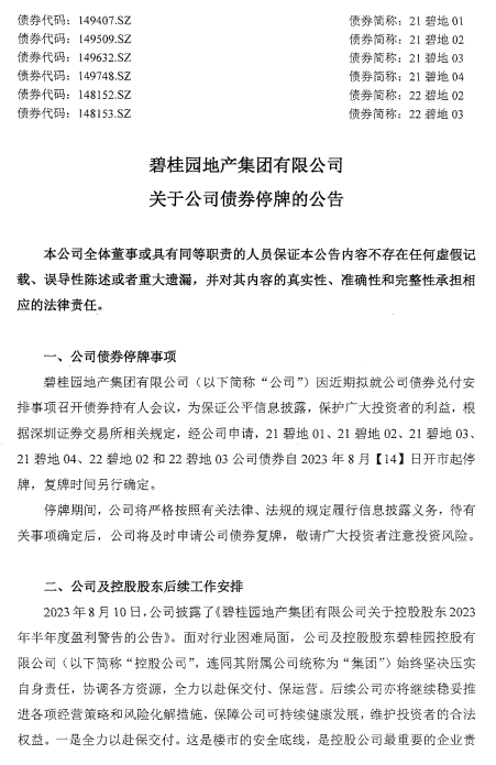 据深交所、上交所8月12日深夜消息,碧桂园发布公告,因近期拟就公司债券兑付安排事项召开债券持有人会议,根据深圳证券交易所相关规定,经公司申请,旗下多只境内公司债券自2023年8月14日开市起停牌,复牌时间另行确定。