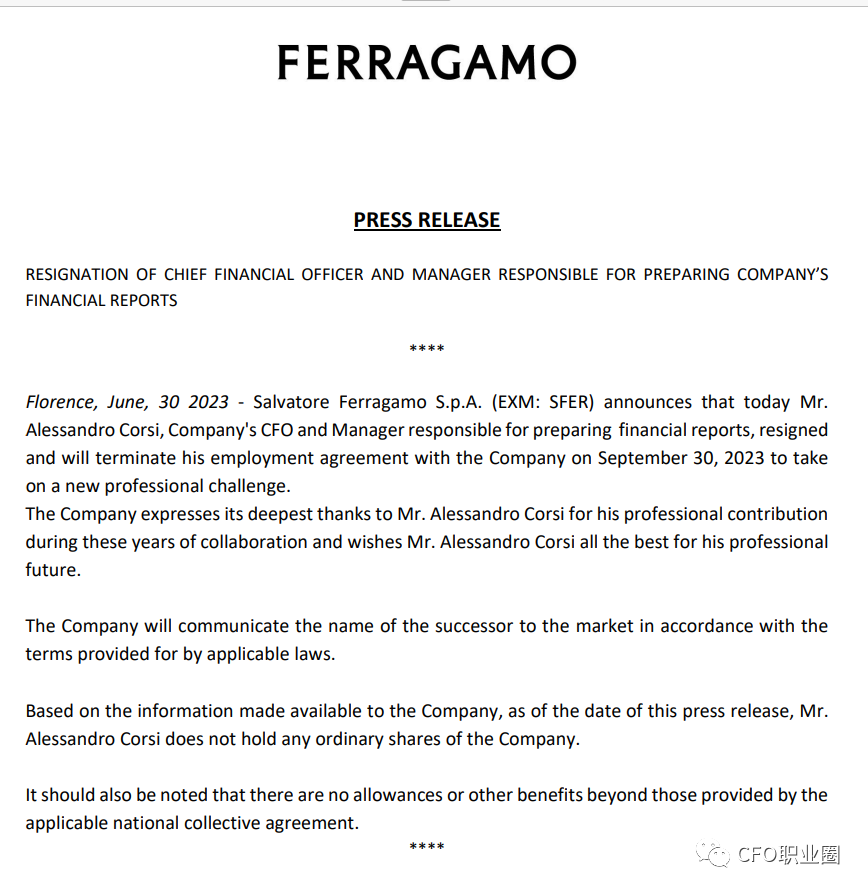 意大利奢侈品牌Salvatore Ferragamo首席财务官Alessandro Corsi于2023年6月宣布将于2023年9月30日离任。