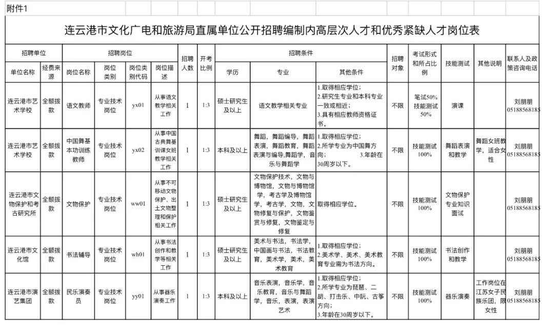具体岗位详见《连云港市文化广电和旅游局直属单位公开招聘编制内高层次人才和优秀紧缺人才岗位表》(附件1,以下简称《岗位表》)。《岗位表》可在连云港市文化广电和旅游局官网