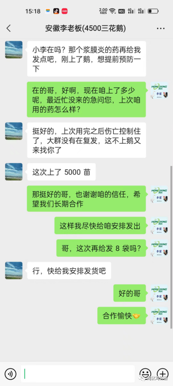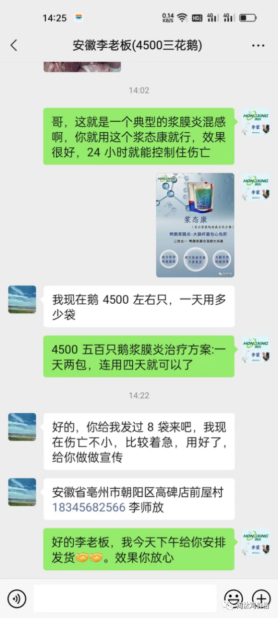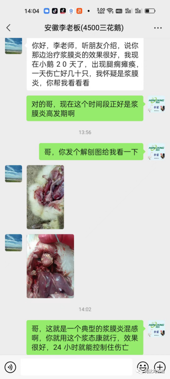 客户案例:话又说回来了,谁说效果好,也不如我们养殖朋友说效果好,养鹅朋友们的眼光是雪亮的。现在给大家分享一个养鹅朋友的用药案例:安徽省李大哥大哥,养殖了十多年鹅了,一年养殖大约三万只鹅,一批大约4500只鹅,每次上鹅都为浆膜炎这个问题头疼,偏偏怕啥来时。这批鹅刚刚二十天,突然出现了走路一瘸一拐、摇头晃脑、站不去来、没精神,粪便也是以白绿色粪便为主,还带着神经症状。一天伤亡五十多只,这可把贾大哥愁坏了,也是跟当地朋友的了解下加了李老师的微信,经过解剖诊断确定是浆膜炎和副黏病毒混合感染,李老师也是给大李哥开了四天的浆膜炎特效药的方案:浆肽康。