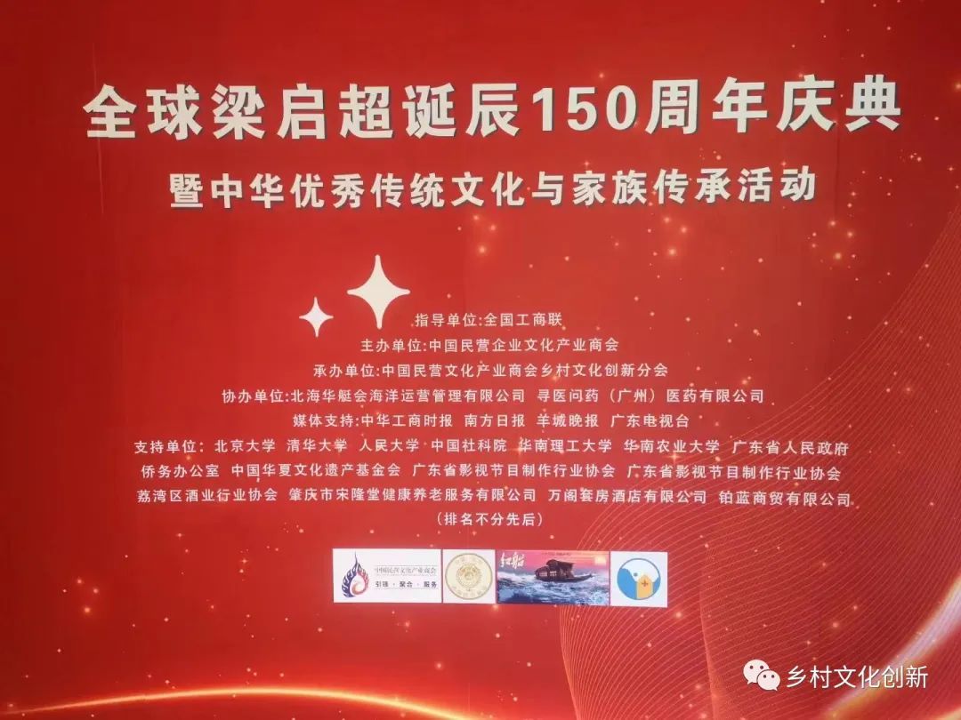全球梁启超诞辰纪念座谈活动”在广州启航,并开启“中华优秀传统文化与家族传承活动”。此项活动由中国民营文化产业商会主办、乡村文化创新分会(筹)等单位承办。