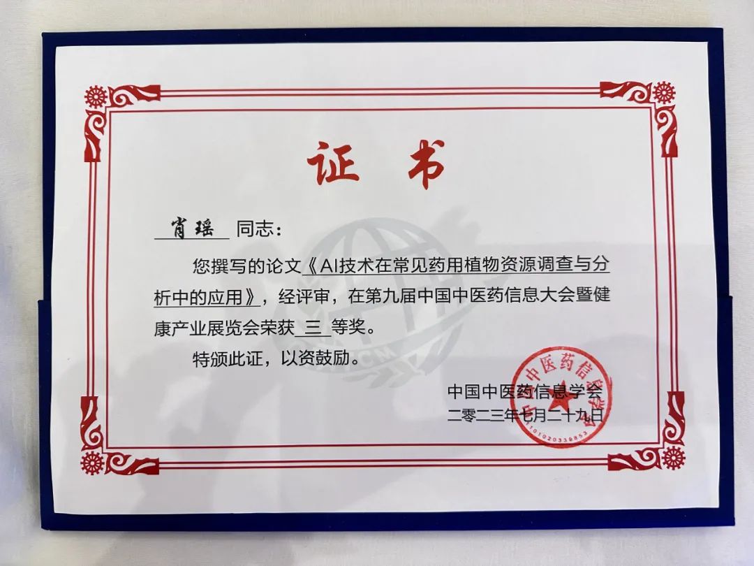 本次大会组织了论文征集活动,并在开幕式上对评选出的优秀论文进行了颁奖,其中,由中国中医药信息学会道地药材分会提交的论文《AI技术在常见药用植物资源调查与分析中的应用》荣获了优秀论文三等奖。