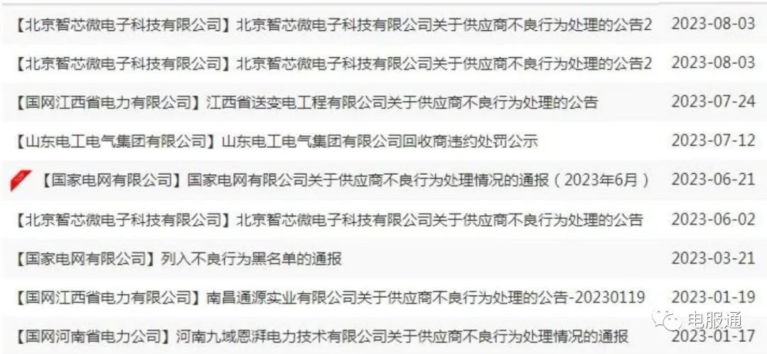 截止目前,国网三产公司2023年在电工交易专区发布了6条关于供应商不良行为的公告(总部2条除外,其中1条重复),具体见下图: