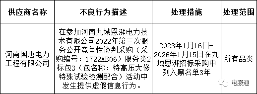 一、2023年第九批物资竞争性谈判(采购编号WZJT-2023-9)于2023年5月17日组织进行,林芝市墨脱110千伏输变电工程装配式围墙(预算金额40.572万元)综合排名第一的供应商陕西德法特电力设备有限公司,2023年6月25日来函放弃中标,按照采购文件以及《国家电网有限公司供应商不良行为处理管理细则》(国网(物资/4)249-2020)第二十六条要求,供应商有下列情况之一的,给予列入黑名单2年的处理:供应商无正当理由,不按招投标文件签订合同的,给予陕西德法特电力设备有限公司列入黑名单2年。