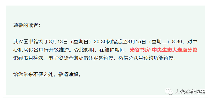 具体通知内容为“:武汉图书馆将于8月13日(星期日)20:30闭馆后至8月15日(星期二)8:30,对中心机房设备进行升级维护。受此影响,在维护期间,光谷书房·中央生态大走廊分馆馆藏书目检索、电子资源查询及借还服务暂停,微信公众号预约功能暂停。