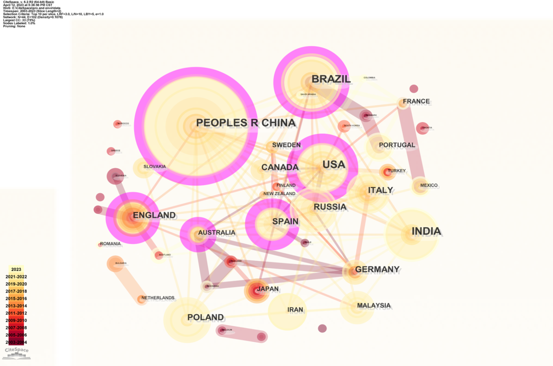 本文将“加工剩余物”、“竹、木”、“环境”联系在一起,意在探究竹、木加工剩余物的产生和处理及其对环境的影响。该领域的研究主要集中在竹、木资源较为丰富的国家,如中国、巴西、澳大利亚、美国等,中国是发文量最多的国家,美国是枢纽作用最大的国家,西班牙也起到了重要的枢纽作用。该领域的研究机构较多,彼此之间的合作范围较窄,机构之间的跨国合作较少,研究者之间的合作主要限于同一机构或团队之间。这表明,该领域的研究尚无在世界范围内影响较为深远的成果,同时,机构间独立研究较多,说明该领域的研究范围较宽、不集中,具有多学科多分支的特点。如圣地亚哥联合大学的Gumersindo Feijoo团队主要进行生命周期评估等环境影响评价的研究,浙江理工大学的张勇团队主要进行木材粘合剂、絮凝剂等材料的研究,四川大学王琪院士团队主要进行木塑复合材料的研究、卢布尔雅那大学的Miha Humar团队主要进行木材与真菌的研究等。