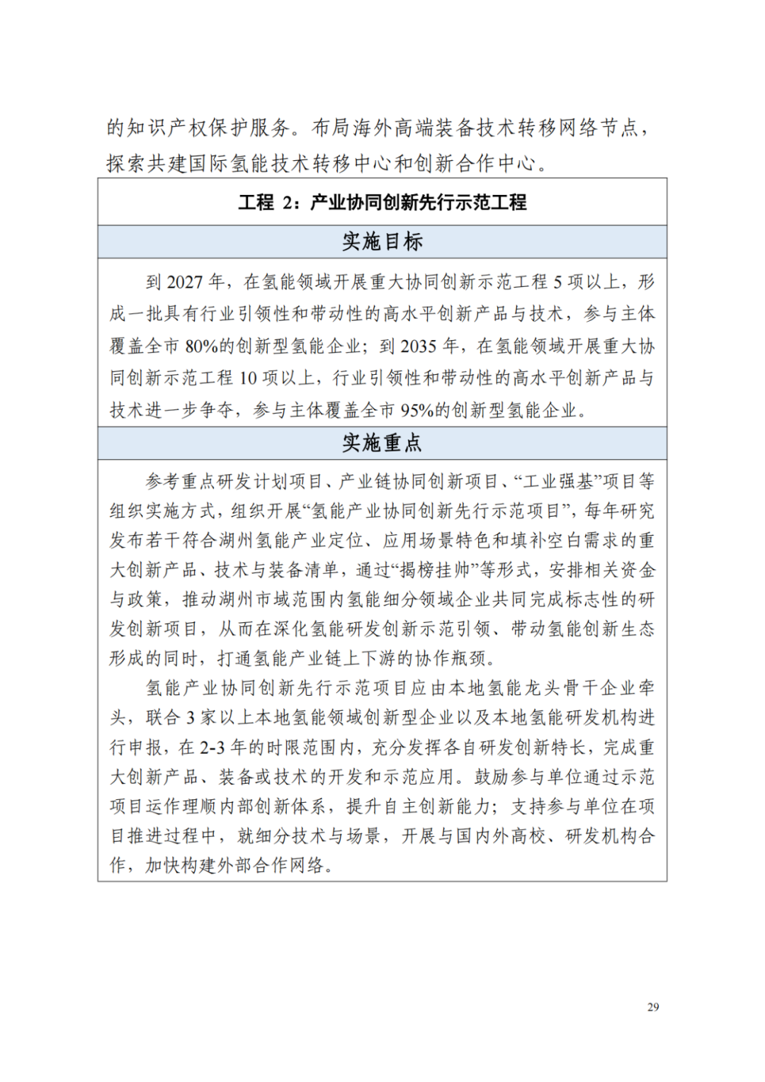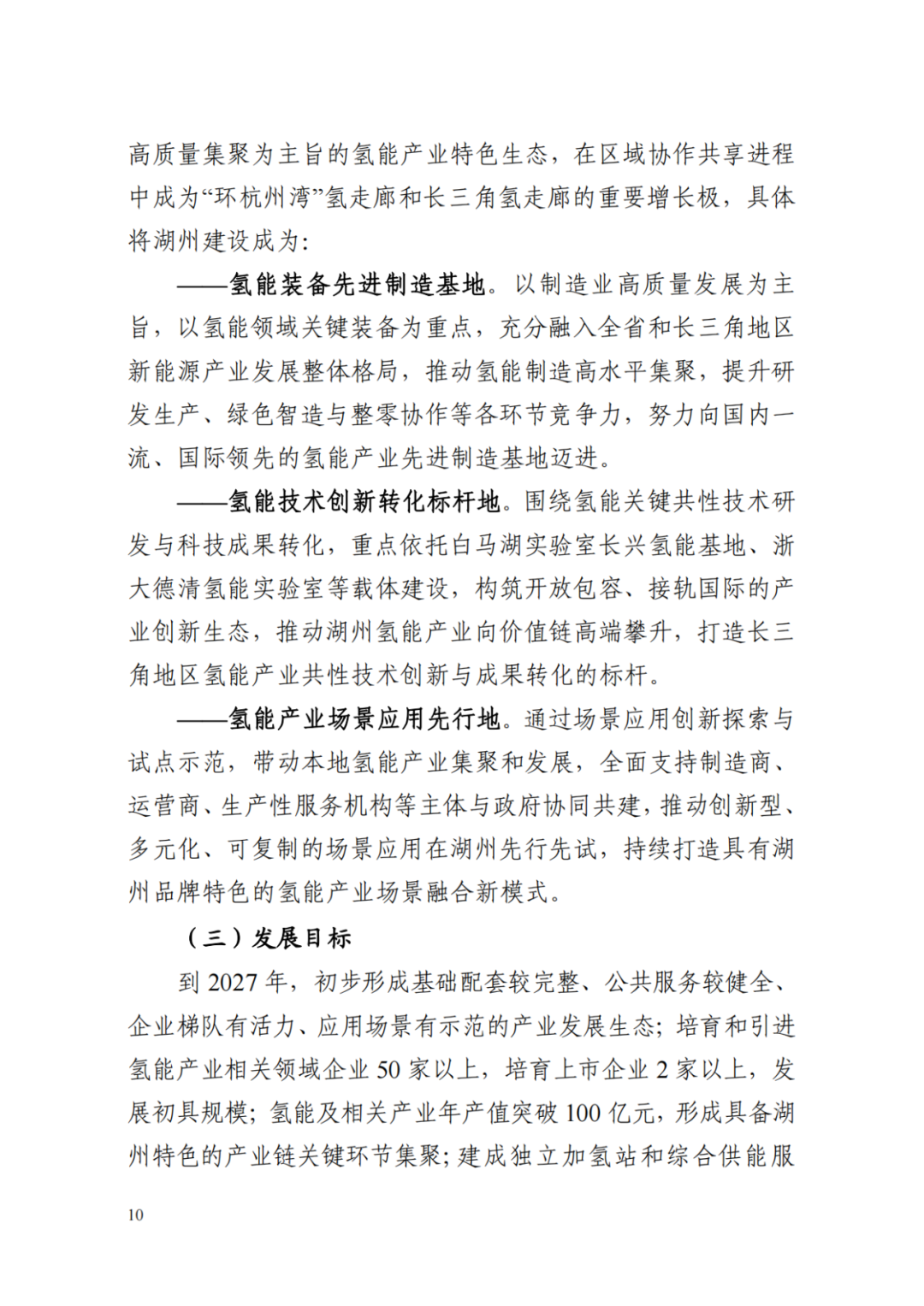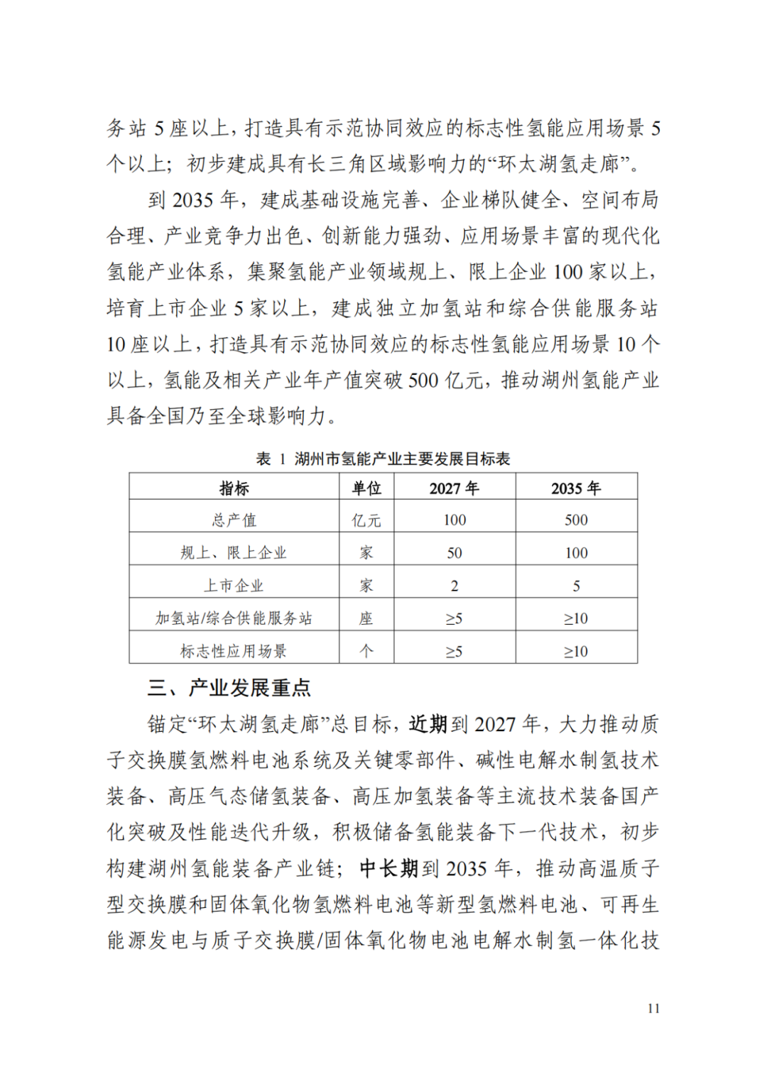 到 2027 年,初步形成基础配套较完整、公共服务较健全、企业梯队有活力、应用场景有示范的产业发展生态;培育和引进氢能产业相关领域企业 50 家以上,培育上市企业 2 家以上,发展初具规模;氢能及相关产业年产值突破 100 亿元,形成具备湖州特色的产业链关键环节集聚;建成独立加氢站和综合供能服务站 5 座以上,打造具有示范协同效应的标志性氢能应用场景 5个以上;初步建成具有长三角区域影响力的“环太湖氢走廊”。