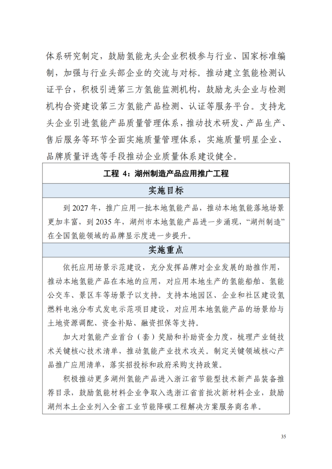 到 2035 年,建成基础设施完善、企业梯队健全、空间布局合理、产业竞争力出色、创新能力强劲、应用场景丰富的现代化氢能产业体系,集聚氢能产业领域规上、限上企业 100 家以上,培育上市企业 5 家以上,建成独立加氢站和综合供能服务站10 座以上,打造具有示范协同效应的标志性氢能应用场景 10 个以上,氢能及相关产业年产值突破 500 亿元,推动湖州氢能产业具备全国乃至全球影响力。
