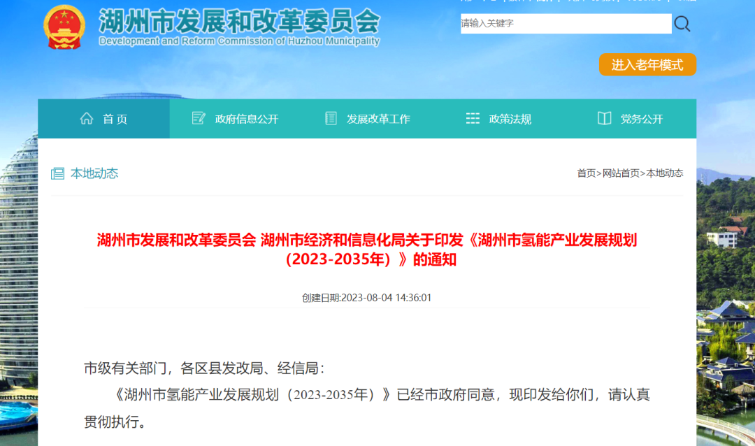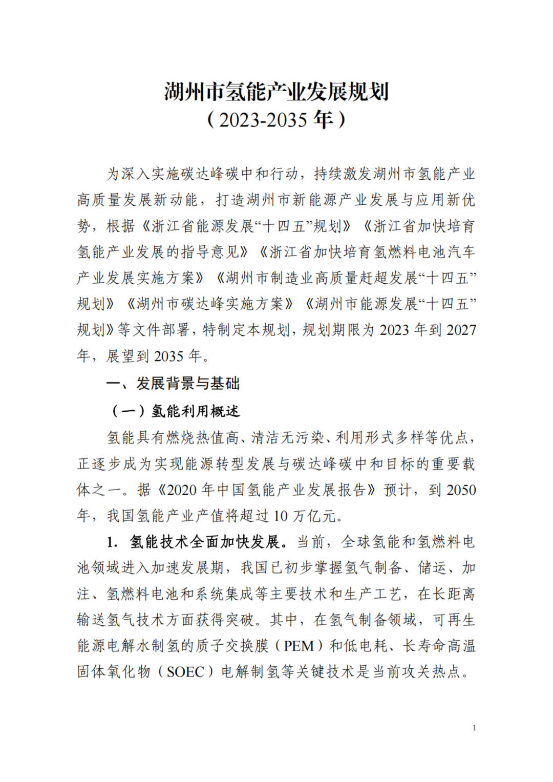 近日,湖州市发改委、湖州市经信局发布《湖州市氢能产业发展规划(2023-2035年)》(以下简称《规划》)。