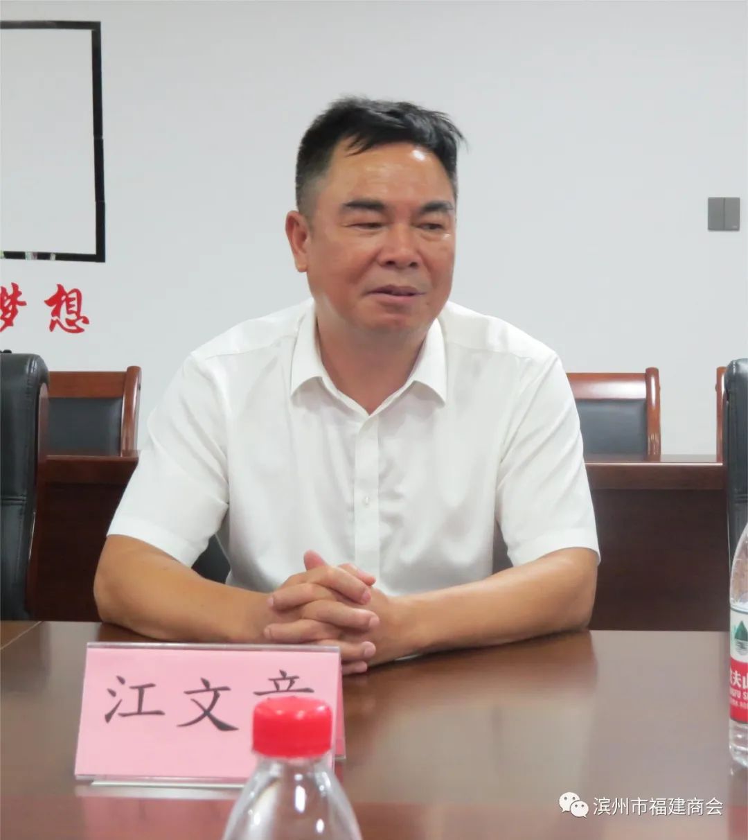 会议由商会执行会长江文章主持,江文章代表商会对庄主席一行在百忙之中莅临商会调研指导工作表示热烈欢迎,同时向庄主席一行介绍了参加座谈会的商会理事会成员,汇报了商会的工作,十几年来商会坚持诚信守法,团结奉献,本着敢拼会赢的闽商精神持续发展,为滨闽两地牵线搭桥,为滨州经济建设和社会发展做出贡献。