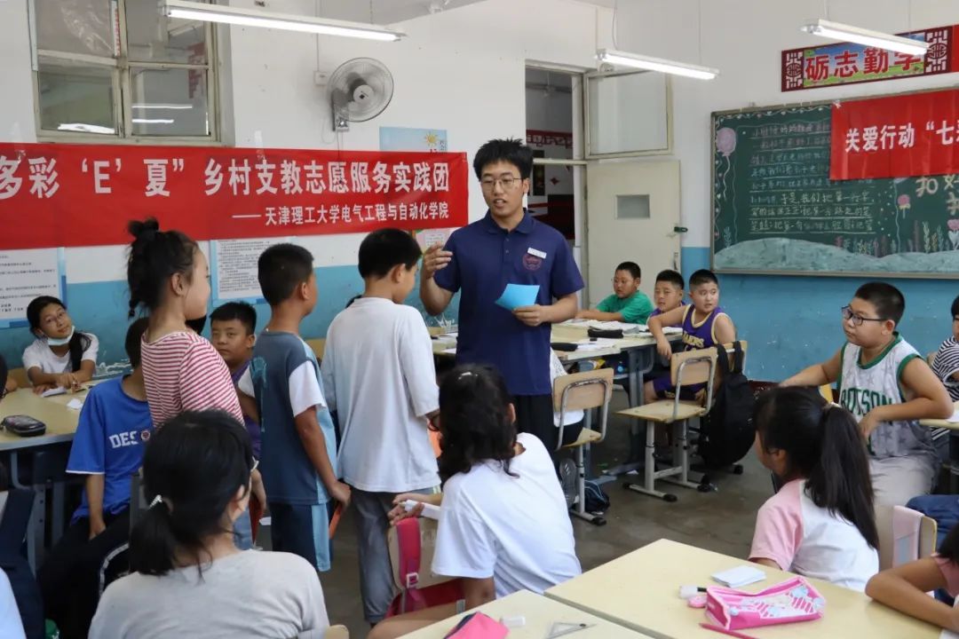 为深入学习宣传贯彻习近平新时代中国特色社会主义思想和党的二十大精神,学习团的十九大精神,贯彻习近平总书记关于青年学生成长成才重要思想,全面贯彻党的教育方针,落实立德树人根本任务,深入推进大中小学思政课一体化建设,引领广大青年学子在追随习近平总书记足迹的生动实践中助力乡村振兴,贡献青春力量。天津理工大学电气工程与自动化学院组建“点燃希望 多彩‘E’夏”乡村支教志愿服务实践团,深入天津市蓟州区乡村开展为期两周的暑期支教活动。
