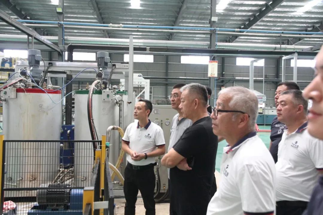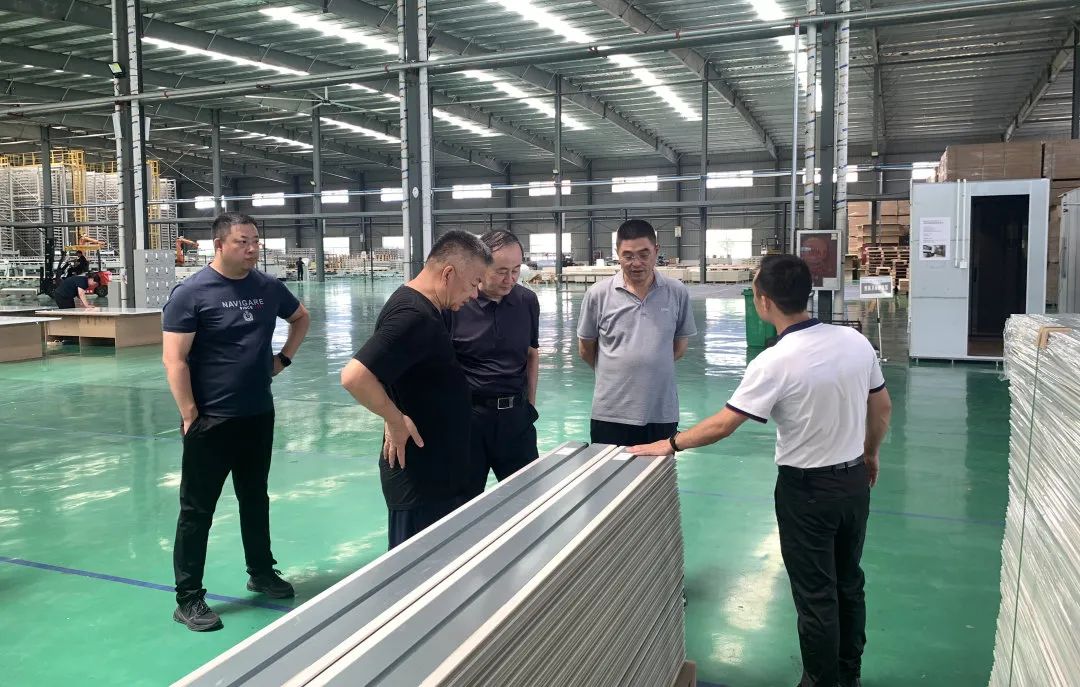 郭董事长一行亲临万华生态新家装平舆工厂的智能制造生产车间,视察各工序的生产情况,了解整体卫浴产能。在整体卫浴产线,郭董事长不仅详细询问了岩板、瓷砖型整体卫浴及彩钢壁板的制造生产流程,还深入了解壁板生产环节聚氨酯发泡填充等情况,并对聚氨酯在性能、使用方法和技术改进等方面给予指导意见,充分说明郭董事长是高度重视产品质量和技术创新的企业家。