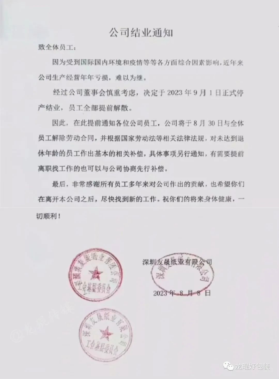 8月8日,深圳市友晟纸业有限公司发布结业通知:受国际国内环境和疫情等各方面综合因素影响,公司近年来生产经营年年亏损,难以为维。经过公司董事会慎重考虑,决定于2023年9月1日正式停产结业,员工全部提前解散。